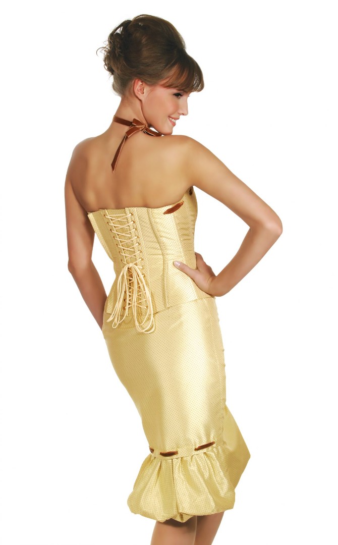 Abbildung: Rock R62 aus Seide „Point“ vanille mit dekoratven Ösen und Samtband, Korsett M24 aus Seide „Point“ vanille mit Extras Nr.62 – dekorativen Ösen und Samtband