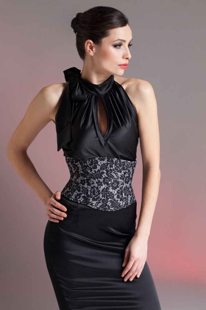 Abbildung: Korsett M8/31 aus Jacquard „Spitze“ opal, Rock R55 aus elastic Satin schwarz, Top3 aus elastic Satin schwarz