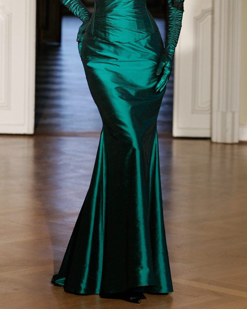 Abbildung: Korsett M „Florence“ aus Dupionseide jade mit einem Pfauenfeder, Rock R21 aus Dupionseide jade