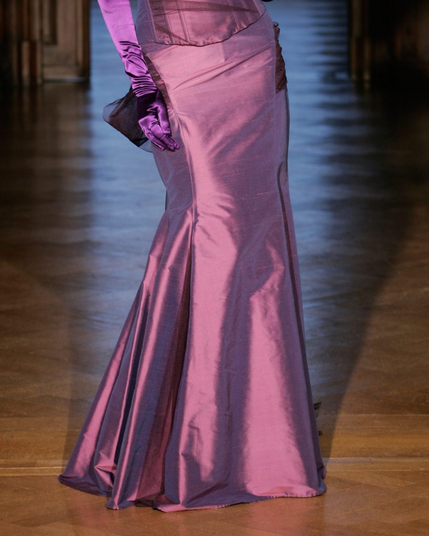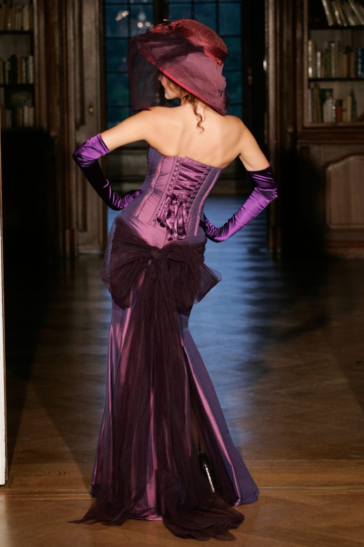 Abbildung: Rock R50 aus Dupionseide violet mit der Schleife hinten aus Tüll, Korsett M24 TU aus Dupionseide violet mit Tüllüberzug vorne