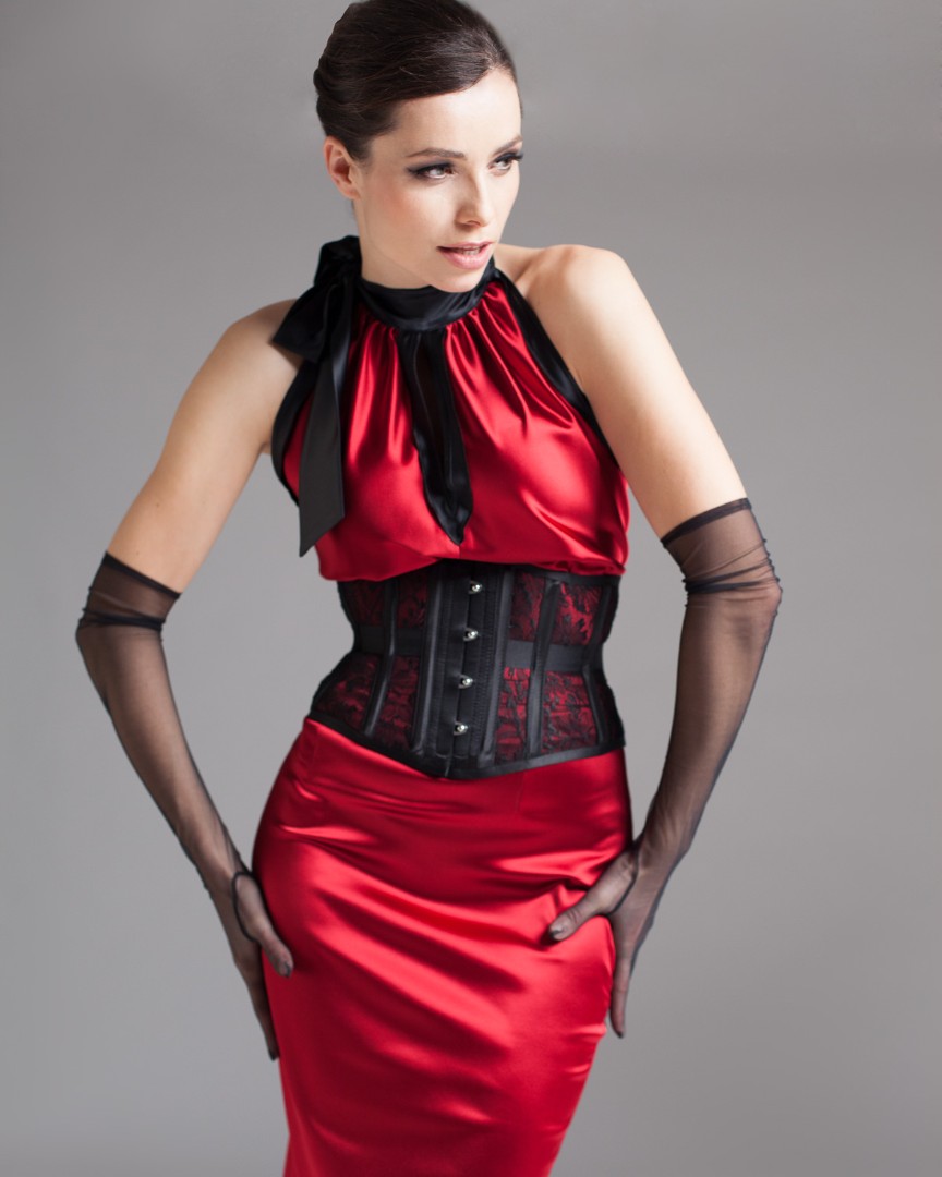 Abbildung: Top3 aus elastic Satin rot mit schwarzer Kante, Rock R55 aus elastic Satin rot, Korsett M51 aus Tüll schwarz
