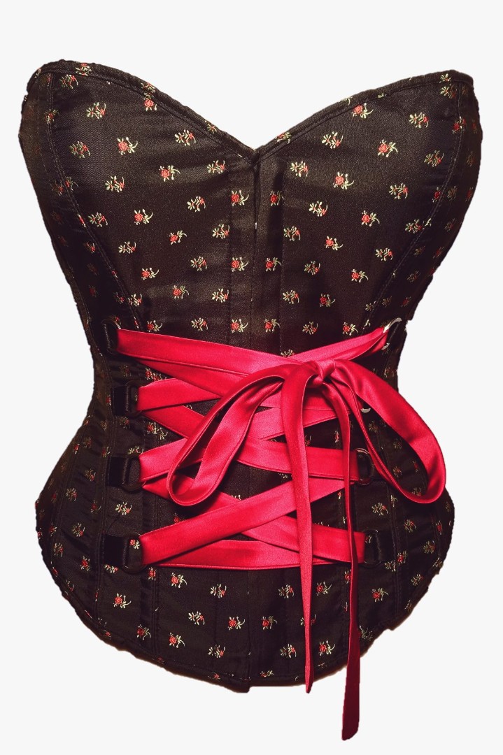 Abbildung: Korsett M2053 /35 aus Jacquard „Blümchen“ schwarz mit dekorativer Schnürung in cherry-rot