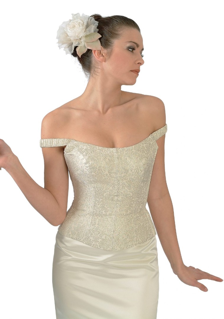 Das Korsett M22 ist ein Trägerkorsett mit ausgestellten Trägern die seitlich über die Schulter führen und einen „Carmen-Ausschnitt“ formen. Das leicht gerundet abschließende Dekolleté kaschiert ein wenig die Brust. Sehr reizvoll ist der vertiefte Rückenausschnitt. Das Modell hat einen leicht gerundeten unteren Abschluss, der Reißverschluss ist in der Seitennaht eingearbeitet. Dieses Korsett verschafft Ihnen den perfekten Auftritt bei gesellschaftlichen Anlässen wie Hochzeiten oder Empfängen.