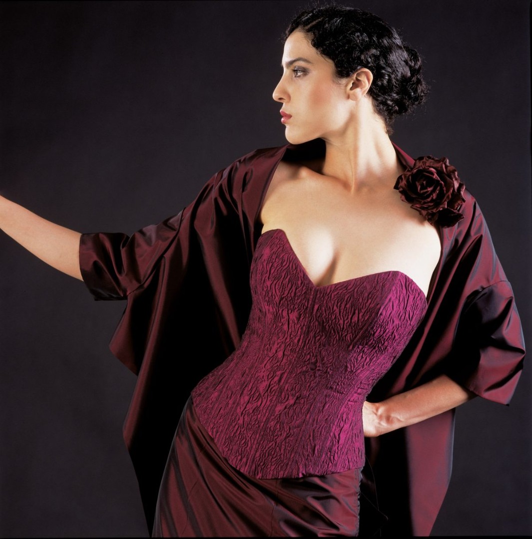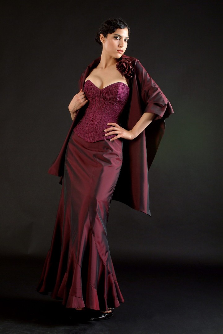 Abbildung: Korsett M26 aus Jacquard „Charme“ fuchsia, Rock R11 aus Taft weinrot