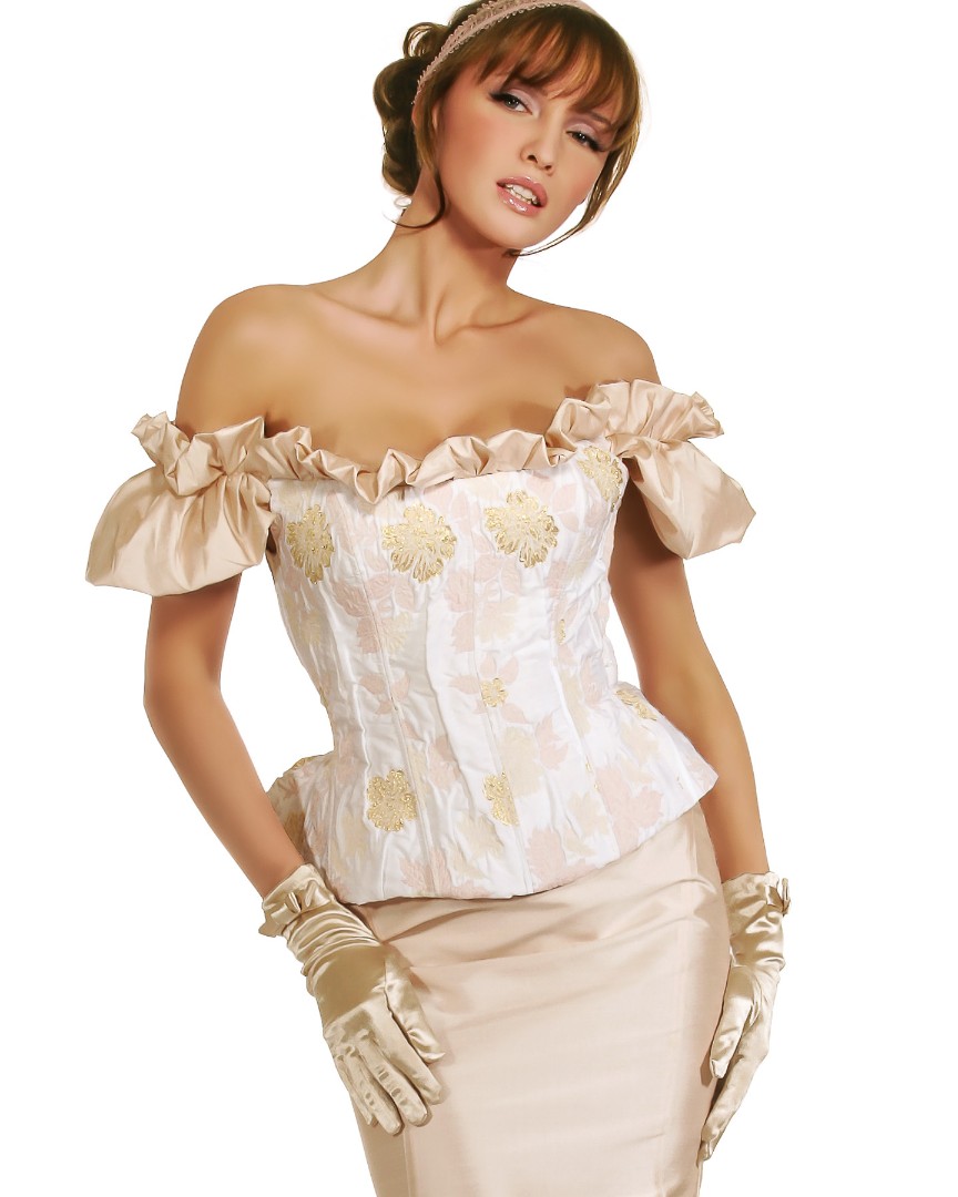 Abbildung: Korsett M50 aus Lurex „Romantik“ weiss/gold, Rock R50 aus Dupionseide tropical creme mit der Schleife hinten aus Tüll