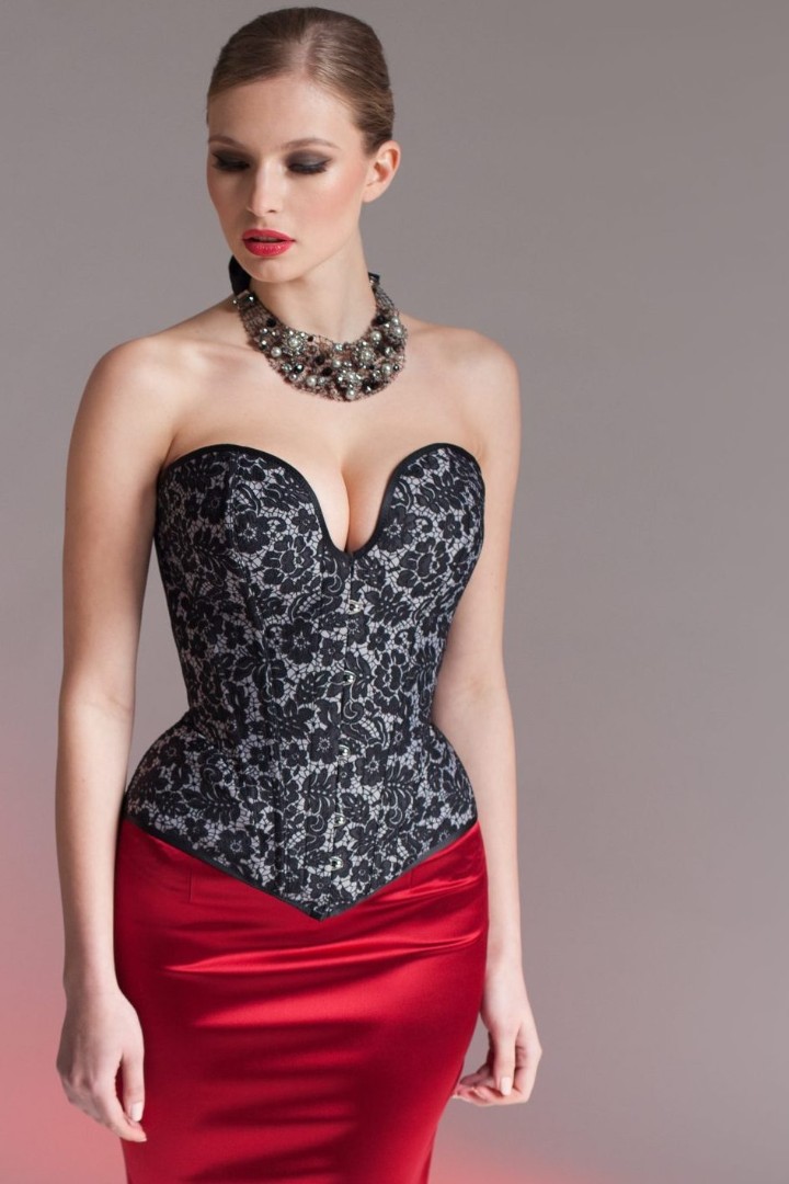 Abbildung: Korsett M54 aus Jacquard „Spitze“ opal, Rock R55 aus elastic Satin rot