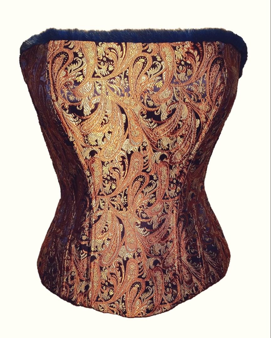 Abbildung: Korsett M24 F aus Jacquard-Seide „Glanz“ kupfer / blau mit Fell am oberen Rand