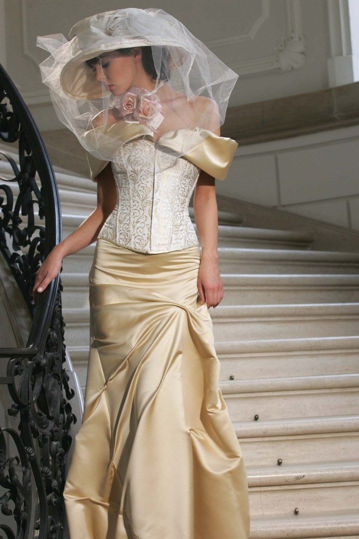 Abbildung: Rock R14 aus Satin haut, Korsett M29 aus Jacquard „Paradis“ champagner mit abnehmbarem Carmen-Kragen