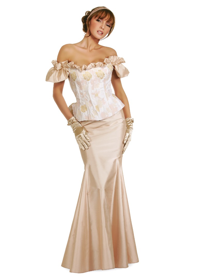 Abbildung: Korsett M50 aus Lurex „Romantik“ weiss/gold, Rock R50 aus Dupionseide tropical creme mit der Schleife hinten aus Tüll